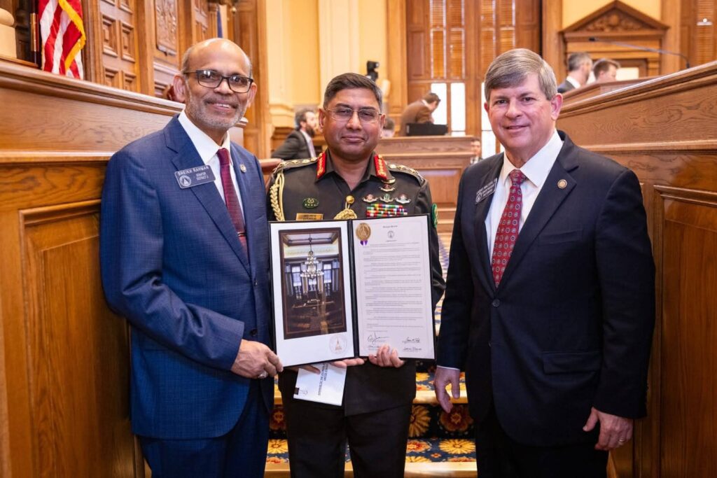 বাংলাদেশ সেনাবাহিনী প্রধান জেনারেল ওয়াকার-উজ-জামান, এসবিপি, ওএসপি, এসজিপি, পিএসসি-কে জাতিসংঘ শান্তিরক্ষা মিশনে বাংলাদেশের শান্তিরক্ষীদের প্রশংসনীয় অবদানের স্বীকৃতিস্বরূপ গত মঙ্গলবার (৩১ মার্চ ২০২৬) জর্জিয়া অঙ্গরাজ্যের একটি বিশেষ রেজ্যুলেশন প্রদান করা হয়েছে। যুক্তরাষ্ট্রের জর্জিয়া রাজ্যের গভর্নর Mr. Brian P. Kemp সিনেটের এক আনুষ্ঠানিক অধিবেশনে সেনাবাহিনী প্রধানের নিকট এ সম্মাননা তুলে দেন।